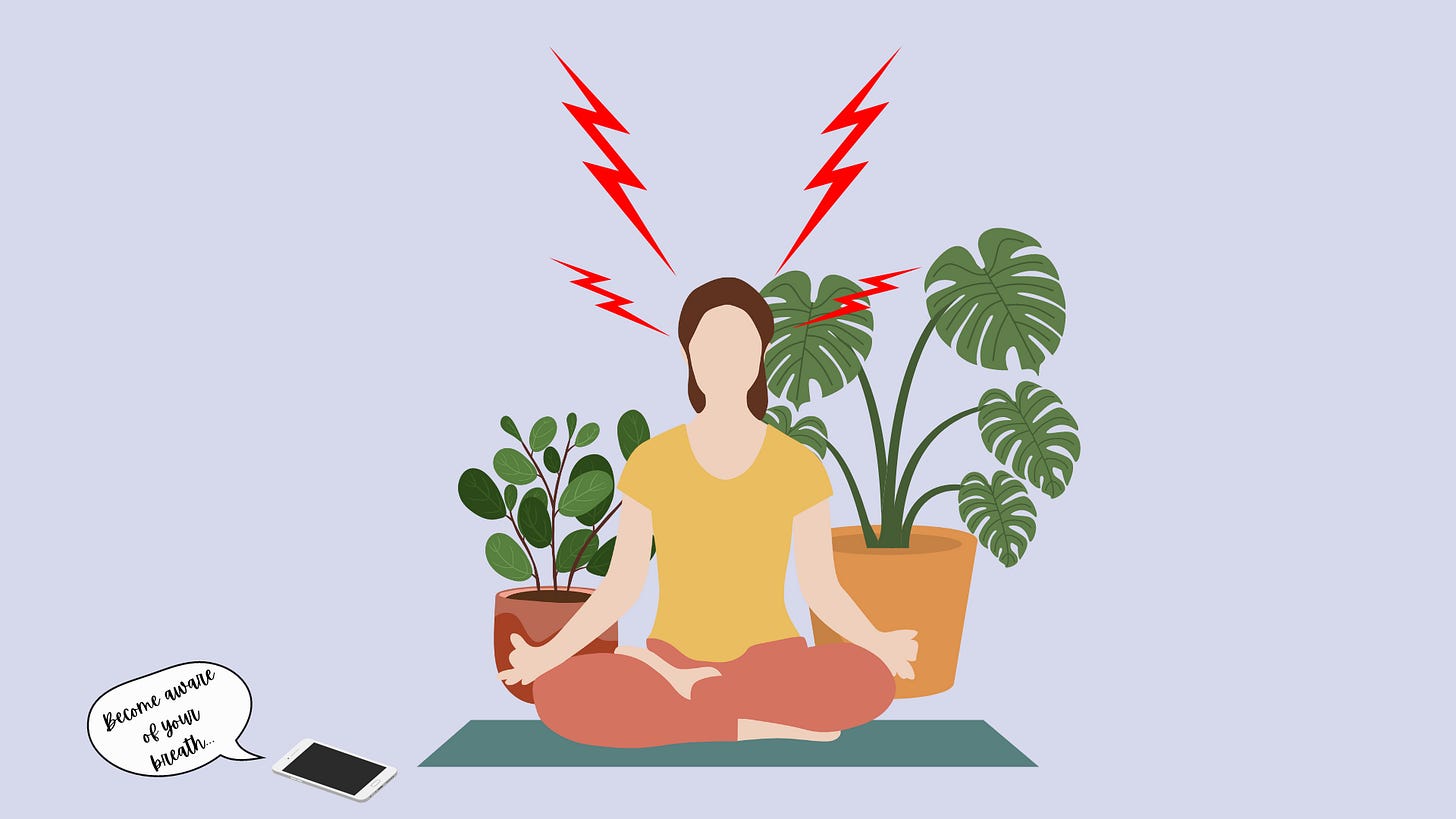 The second, ironically, is inspired by one of the things I’ve heard Mr. Problematic App-Founder say, which is that anything can be an object of mindfulness — breath, bodily sensations, sounds, thoughts, emotions. So it follows that my complicated feelings about the person whose voice is speaking into my ear, telling me how to meditate, are themselves ripe for being meditated upon. What would happen if I turned towards those feelings with curiosity, rather than letting myself get lost in them until I give up and run away?
